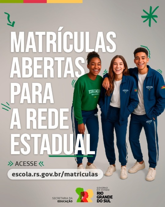 O processo de rematrícula, para quem já é aluno da Rede Estadual, também ocorre nesta data. Ainda, todos os estudantes da Rede Estadual têm direito a uniformes gratuitos, que devem ser solicitados até o dia 2 de novembro em escola.rs.gov.br/uniformes. Mais informações em educacao.rs.gov.br